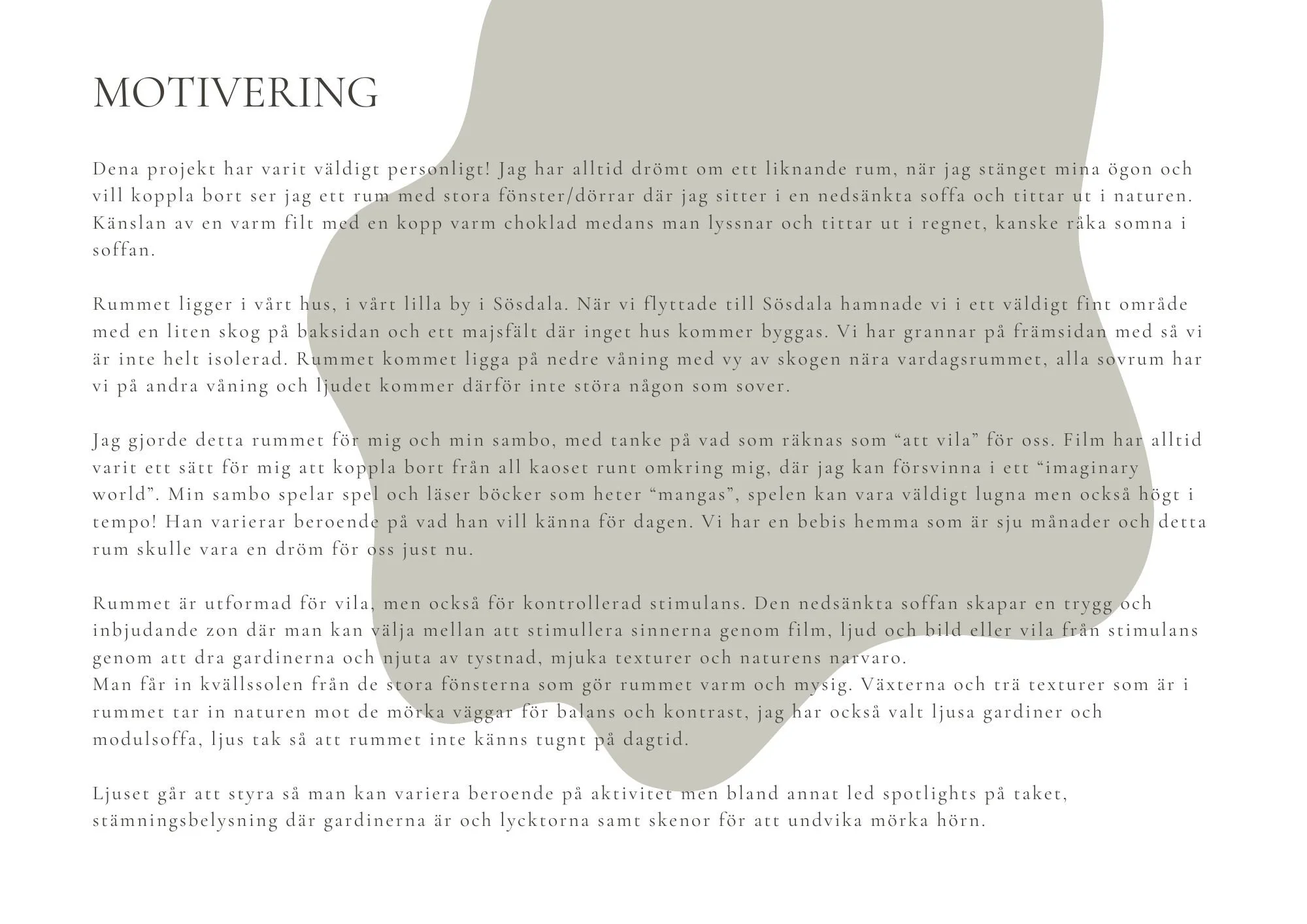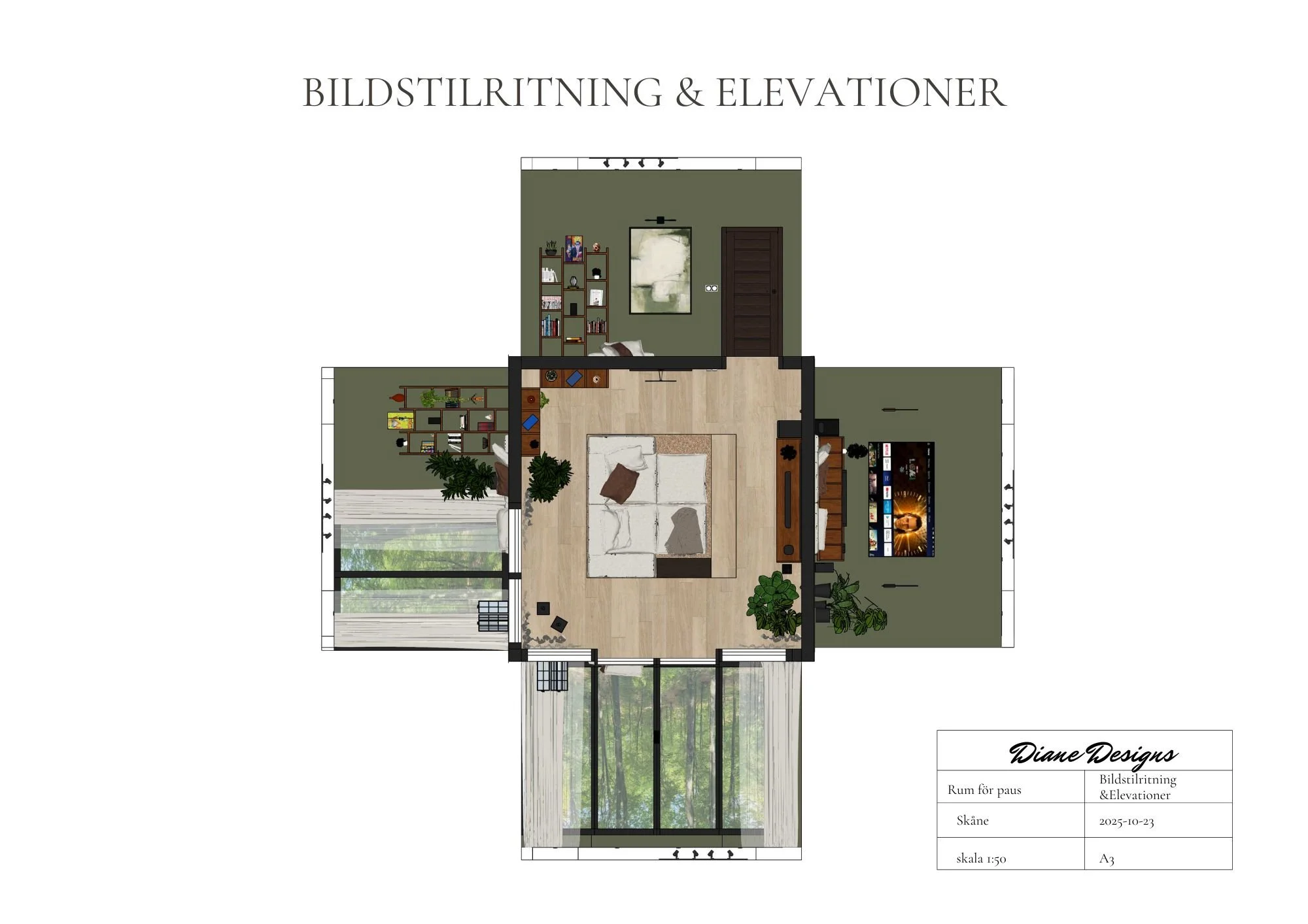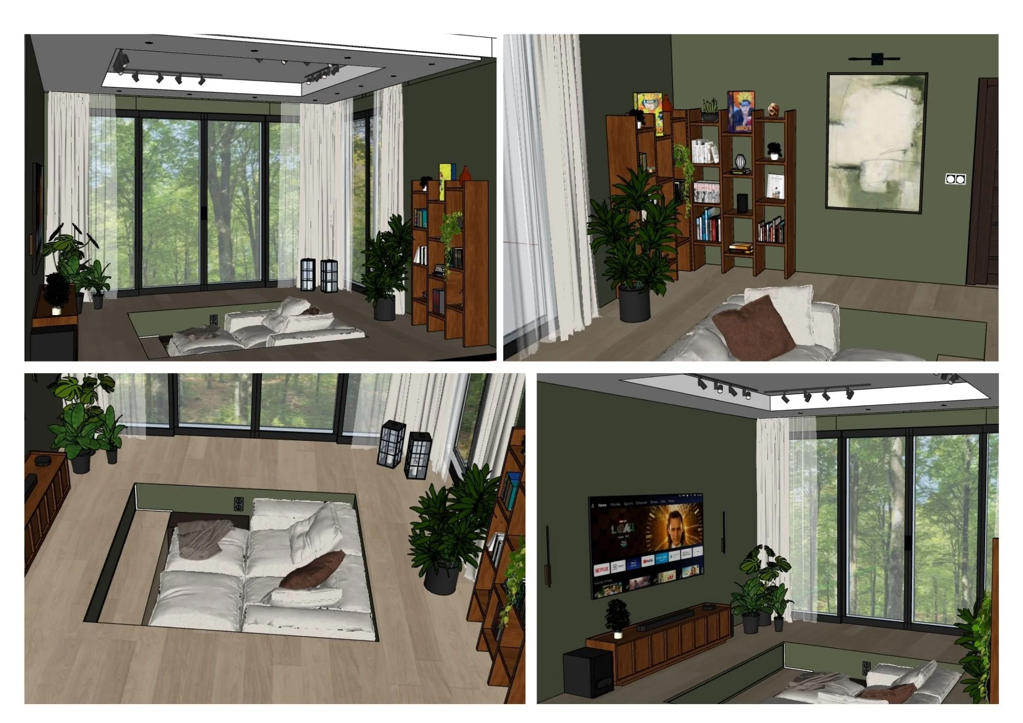 A space to pause was my final school project that was directed to me and my partner. We are a big movie family, he reads books (Manga to be specific) and plays games. A room like this would be perfect for us. I have always dreamt of a sunken sofa in a room where i could escape from reality a bit, in this room when dark we can enjoy a good movie ,a little gaming session or even a nap. When the curtains are open, a cup of tea while reading a book with a view of just nature is a dream.